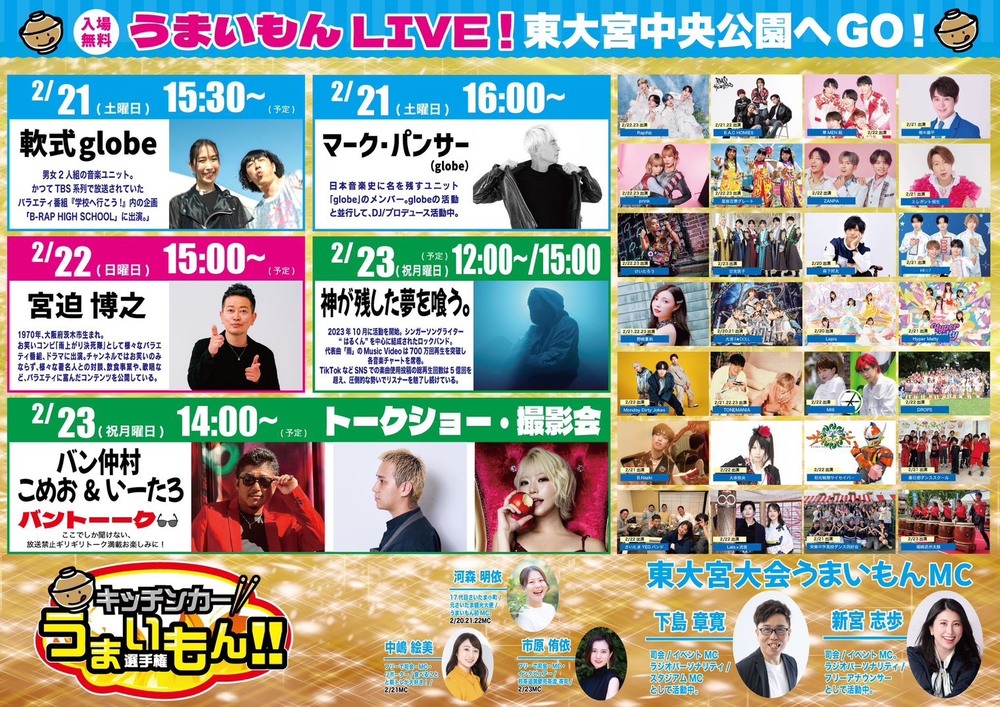 『うまいもん選手権』 出演決定!! SCHEDULE 2026/02/23(月) 埼玉県 東大宮中央公園 地図を表示 2月21日〜23日に埼玉県東大宮中央公園で開催される『キッチンカー うまいもん!!選手権』に神が残した夢を喰う。の出演が決定! 神が残した夢を喰う。の出演は2月23日になります。 出演場所はメインステージで出演時間は12:00~と15:00からの2回出演となります。 お楽しみに! URLをコピーする 報告する